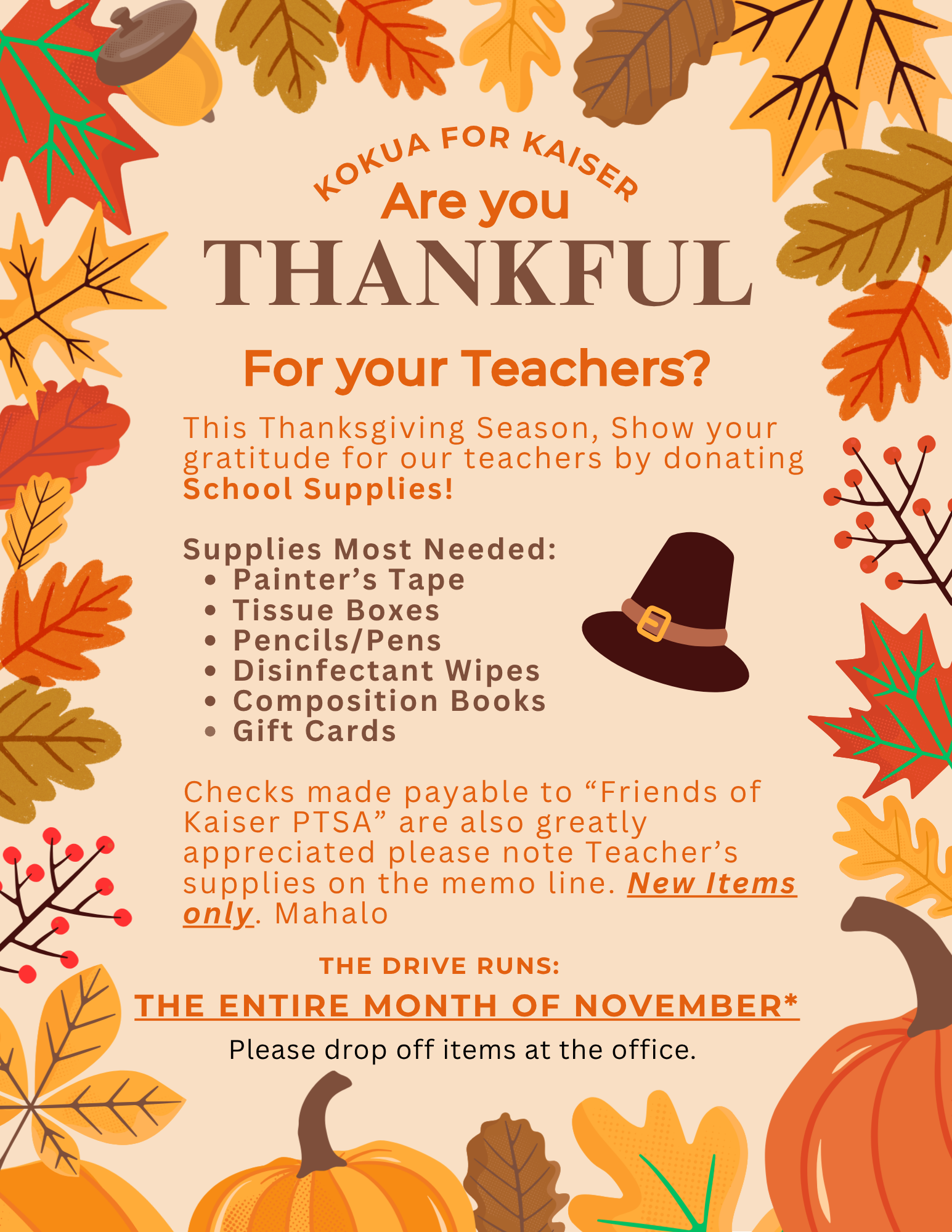 For monetary donations, checks can be made to the “Friends of Kaiser PTSA, please note Teacherʻs Supplies on the memo line. New Items only, please.