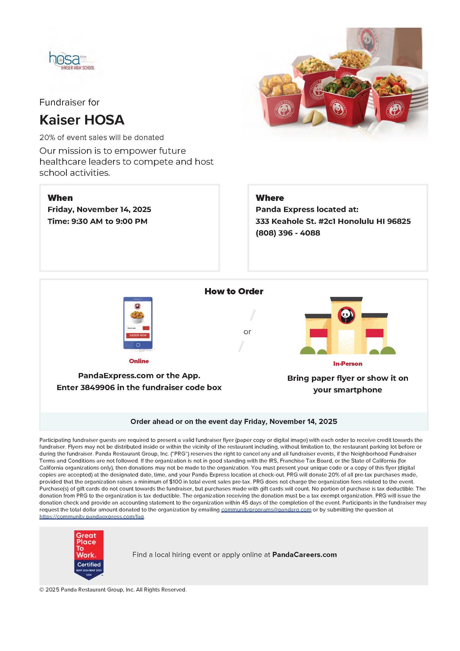 HOSA CLUB PANDA EXPRESS FUNDRAISER, HAWAII KAI TOWNE CENTER