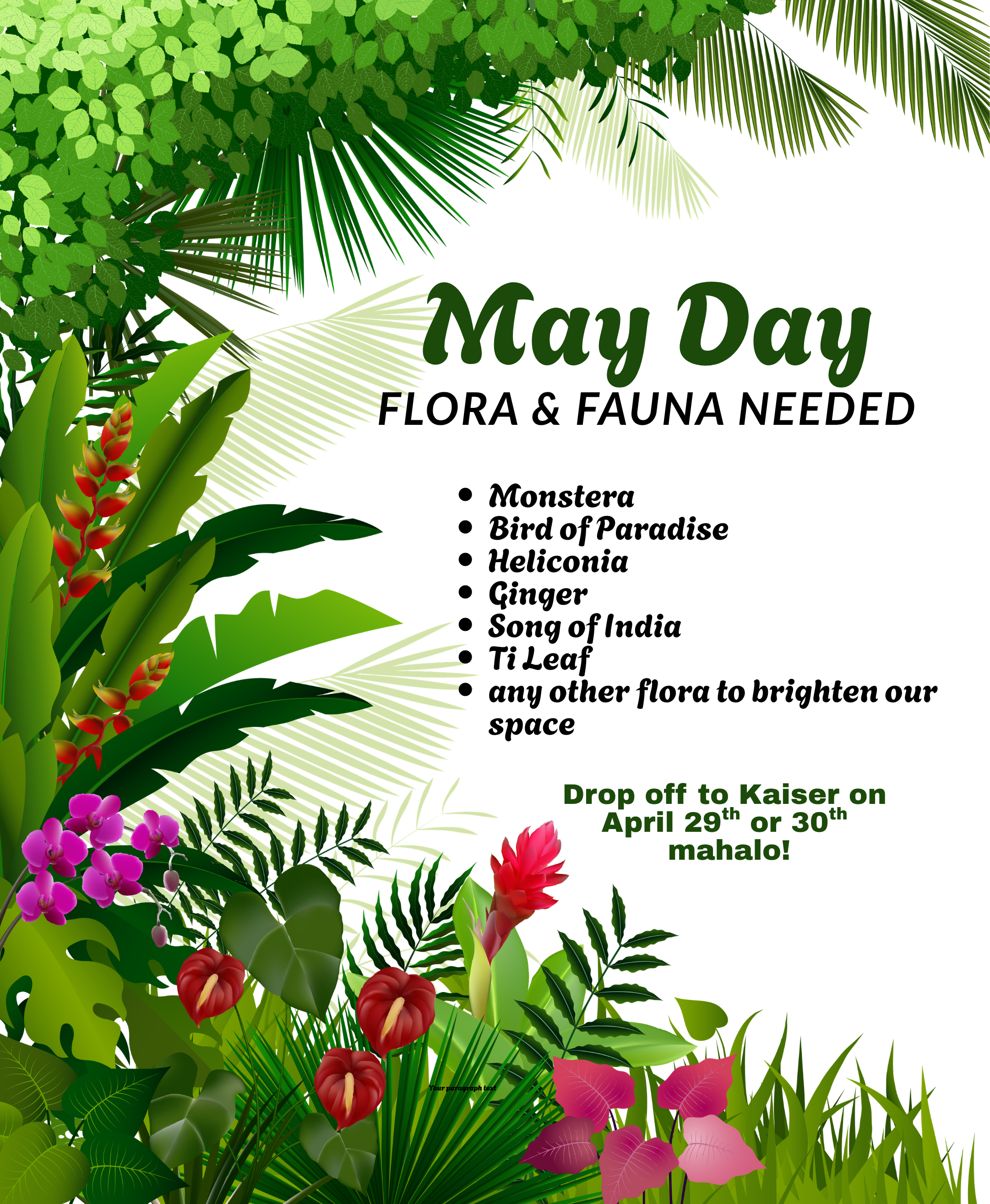 Aloha Kaiser ‘ohana, As we prepare for our upcoming Ho‘ike (May Day) on May 1st, we are reaching out to our community for kokua! We are looking for greenery and flowers from your yards to help transform our gym into a beautiful, vibrant space for our students’ performances.