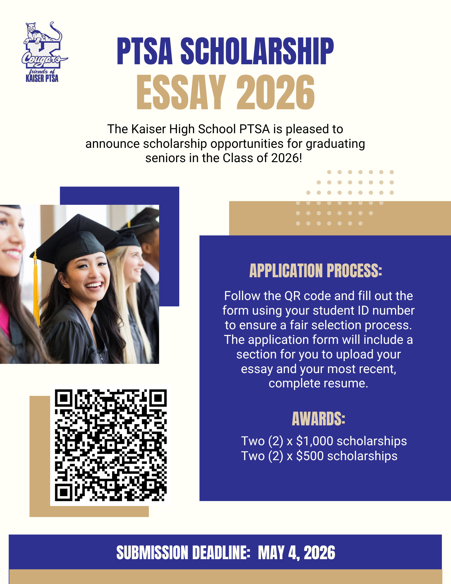 The Kaiser High School PTSA is pleased to announce scholarship opportunities for graduating seniors in the Class of 2026! We will be awarding four scholarships: